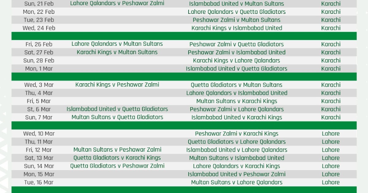 Psl schedule 2021 time table has been announced by pcb. Cricket schedule of psl 2021 beginning in february 2021 time table of all cricket matches of pakistan super league 2021 domestic tournament. Pakistan super league which is known as psl t20 is one the leading t20 competition going around in the circuit. Pakistan super league 2021 s quad psl 6 squad are the international and national players that will bw in action in psl 2021. Pakistan super league 2021 schedule.